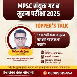 MPSC संयुक्त गट ‘ब’ 2025 मुख्य परीक्षेची तयारी करणाऱ्या विद्यार्थ्यांसाठी एक महत्त्वाची संधी उपलब्ध झाली आहे. स्पर्धा परीक्षेतील यशस्वी अधिकारी नितीश पाटील (STI, 2024) यांच्या मार्गदर्शनाखाली मोफत विशेष सत्राचे आयोजन करण्यात आले आहे.
