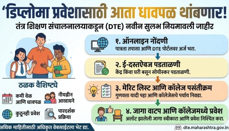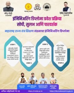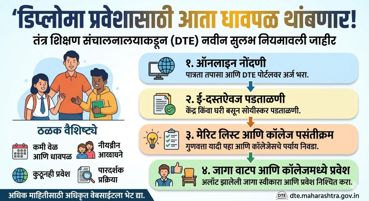 महाराष्ट्र राज्यातील अभियांत्रिकी पदविका (इंजिनिअरिंग डिप्लोमा) अभ्यासक्रमांच्या प्रवेश प्रक्रियेला अधिक पारदर्शक आणि सुलभ बनवण्यासाठी राज्य तंत्र शिक्षण मंडळाने (MSBTE) महत्त्वपूर्ण पाऊल उचलले आहे. विद्यार्थ्यांचा प्रवेश प्रवास सोपा व्हावा यासाठी तंत्र शिक्षण संचालनालयाने (DTE) ऑनलाइन प्रणालीद्वारे चार टप्प्यांची प्रवेश प्रक्रिया जाहीर केली आहे.