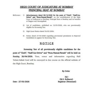 बॉम्बे उच्च न्यायालयाच्या भरती प्रक्रियेत महत्त्वाचा निर्णय घेण्यात आला असून, अर्ज नाकारण्यात आलेल्या उमेदवारांनाही चाळणी (Screening) परीक्षेला बसण्यासाठी तात्पुरती परवानगी देण्यात आली आहे. ही सूचना दिनांक २७ मार्च २०२६ रोजी जारी करण्यात आली आहे.