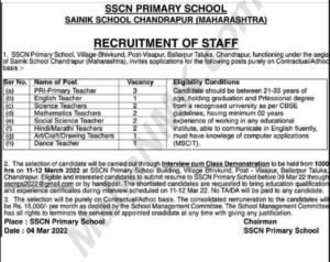 पदाचे नाव- प्राथमिक शिक्षक, इंग्रजी शिक्षक, विज्ञान शिक्षक, गणित शिक्षक, सामाजिक शास्त्र शिक्षक, हिंदी-मराठी शिक्षक, कला क्राफ्ट चित्रकला शिक्षक, नृत्य शिक्षक.