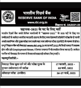रिझर्व्ह बँक ऑफ इंडिया अंतर्गत सहाय्यक पदाच्या एकूण 950 रिक्त जागांसाठीच्या भरतीसाठी अर्ज करण्याची आज अंतिम मुदत