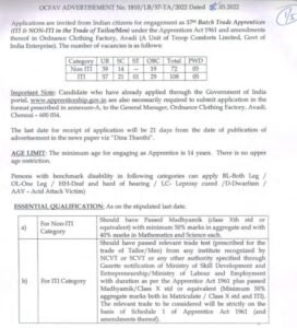 अर्ज पाठविण्याचा पत्ता- The General Manager, Ordnance Clothing Factory, Avadi, Chennai – 600 054