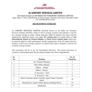 पदाचे नाव- उप टर्मिनल व्यवस्थापक, ड्यूटी मॅनेजर, अधिकारी, कनिष्ठ कार्यकारी, वरिष्ठ ग्राहक एजंट/ ग्राहक एजंट/ कनिष्ठ ग्राहक एजंट, रॅम्प सर्व्हिस एजंट/युटिलिटी एजंट सह रॅम्प ड्रायव्हर, हँडीमन