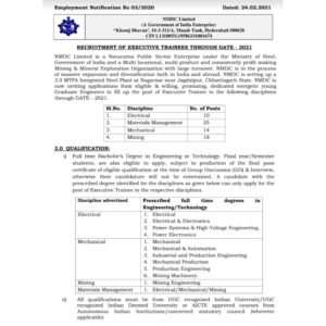 शैक्षणिक पात्रता- (i) 60% गुणांसह संबंधित विषयात B.E/B.Tech [SC/ST/PWD: 50% गुण] (ii) GATE 2021