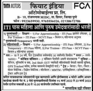 मुलाखतीचा पत्ता- Fiat India Automobiles Pvt Ltd, Gate No 02, B-19, रांजणगाव M I D C, तालुका शिरूर, पुणे-412210