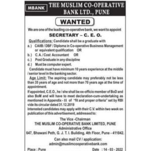 पदवीधरांना संधी! मुस्लिम सहकारी बँक पुणे अंतर्गत भरती
