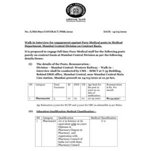 मुलाखतीचा पत्ता- T-55 बिल्डिंग, DRM ऑफिसच्या मागे, मुंबई सेंट्रल, मुंबई सेंट्रल मेन लाईन स्टेशनजवळ, मुंबई ४००००८