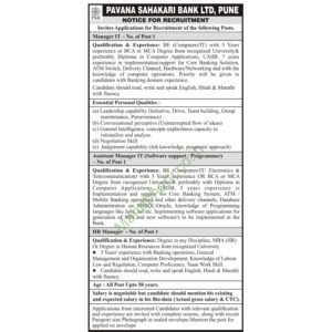 अर्ज पाठविण्याचा पत्ता- अध्यक्ष, पवना सहकारी बँक लि. प्लॉट नं. सी-20, एच-ब्लॉक, पिंपरी औद्योगिक क्षेत्र, ऑटो क्लस्टरजवळ, चिंचवड, पुणे-411019.