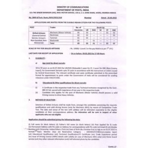 मेकॅनिक (मोटर व्हेईकल): (i) संबंधित ITI किंवा 08वी उत्तीर्ण+01 वर्षे अनुभव (ii) अवजड वाहन चालक परवाना