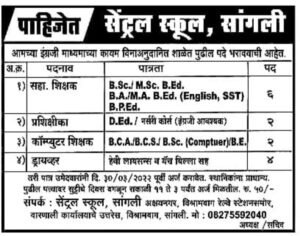मध्यवर्ती शाळा सांगली अंतर्गत विविध रिक्त पदांची भरती