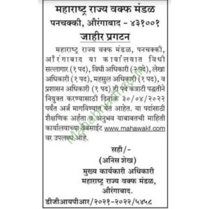 महाराष्ट्र राज्य वक्फ मंडळ औरंगाबाद येथे रिक्त जागांसाठी भरती