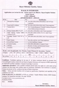 मुलाखतीचा पत्ता- रयत इंग्लिश मीडियम स्कूल, एसजीएम कॅम्पस, सैदापूर, ता. कराड जि-सातारा -415124
