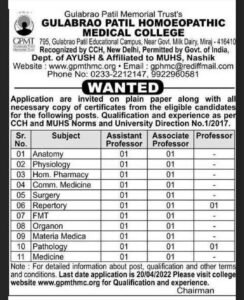 गुलाबराव पाटील होमिओपॅथिक मेडिकल कॉलेज येथे प्राध्यापक पदांची भरती