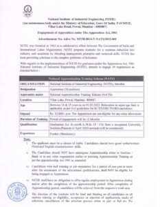 राष्ट्रीय औद्योगिक अभियांत्रिकी संस्था, मुंबई अंतर्गत भरती