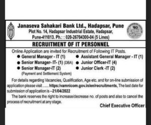 जनसेवा सहकारी बँक हडपसर, पुणे अंतर्गत विविध पदांची भरती