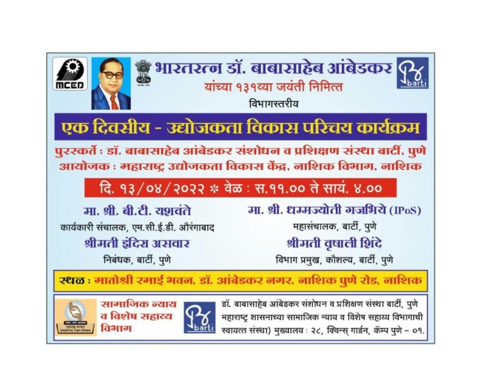 डॉ. बाबासाहेब आंबेडकर संशोधन व प्रशिक्षण संस्था (बार्टी), पुणे द्वारा पुरस्कृत व महाराष्ट्र उद्योजकता विकास केंद्र (MCED), नाशिक यांच्या मार्फत भारतरत्न डॉ. बाबासाहेब आंबेडकर यांच्या जयंती निमित्त विभागस्तरीय एक दिवसीय विनामुल्य उद्योजकता विकास परिचय कार्यक्रम दिनांक १३.०४.२०२२ रोजी स. १०.३० ते सायं. ४.०० वाजेपर्यंत मातोश्री रमाई सभागृह, डॉ. आंबेडकर नगर, नाशिक पुणे रोड, नाशिक येथे आयोजित केलेला आहे. इच्छुक उमेदवारांनी नोंदणीसाठी खालील फॉर्म भरून दिनांक १३.०४.२०२२ रोजी स. १०.३० वाजता कार्यक्रमास उपस्थित रहावे.