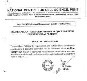 अर्जाची प्रत पाठवण्याचा पत्ता- डायरेक्टर, नॅशनल सेंटर फॉर सेल सायन्स (NCCS), S. P. पुणे युनिव्हर्सिटी कॅम्पस, पोस्ट – गणेशखिंड, पुणे- 411007