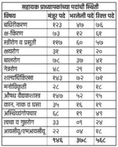 नेत्र शल्यचिकित्सा विभागातील सहायक प्राध्यापकांच्या सर्वात कमी म्हणजे ४० टक्के जागा रिक्त आहेत. क्ष-किरणशास्त्र विभागात सर्वाधिक ८४ टक्के, ‘आयसीयू विभागात ८१ टक्के, त्वचा व गुप्तरोग विभागात ७५ टक्के, अस्थिव्यंगोपचार विभागात ७२ टक्के, क्षयरोग व औषध वैद्यकशास्त्र विभागात ६५ टक्के, मनोविकृतीशास्त्र विभागात ६४ टक्के, बधिरीकरणशास्त्र विभागात ६१ टक्के, कान, नाक व घसा विभागांत ५४ टक्के, बालरोग विभागात रेल ५३ टक्के, स्त्रीरोग व प्रसतिशास्त्र विभाग व शल्य चिकित्साशास्त्र विभागात प्रत्येकी ४९ टक्के जागा रिक्त आहेत.