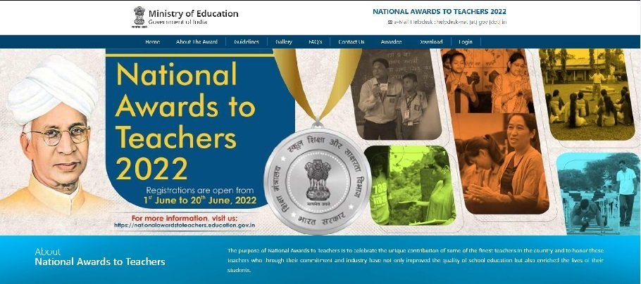 या पुरस्कारासाठी https://nationalawardstoteachers.education.gov.in या वेब पोर्टलवर नावनोंदणी सुरू झाली आहे. या राष्ट्रीय पुरस्कारासाठी राज्यातील शासकीय, स्थानिक स्वराज्य संस्थांच्या शाळा व मान्यताप्राप्त अनुदानित खाजगी प्राथमिक / माध्यमिक / उच्च माध्यमिक शाळांतील इच्छुक पात्र शिक्षकांनी दि. २० जून २०२२ पर्यंत ऑनलाईन नोंदणी करावी, असे आवाहन राज्याचे माध्यमिक व उच्च माध्यमिक शिक्षण संचालक महेश पालकर यांनी केले आहे.
