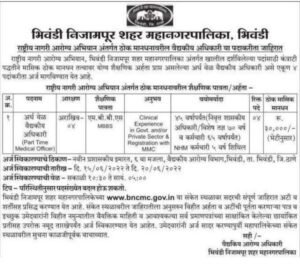 अर्ज पाठविण्याचा पत्ता- भिवंडी निजामपूर शहर महानगरपालिका, नवीन प्रशासकीय इमारत, वैधकीय आरोग्य विभाग, 6 वा मजला भिवंडी, जि. ठाणे
