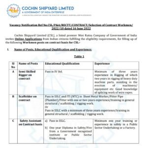 नोकरी विषयी कोचीन शिपयार्ड मध्ये मोठी भरती By Chetan Patil On Jun 28, 2022 0 Share पद संख्या- 106 जागा शैक्षणिक पात्रता- शैक्षणिक पात्रता जाणून घेण्यासाठी मूळ जाहिरात सविस्तर वाचा अर्ज पद्धती- ऑनलाइन अर्जाची शेवटची तारीख- 08 जुलै 2022 अधिकृत वेबसाईट- cochinshipyard.in 0 Share FacebookTwitterGoogle+ReddItWhatsAppPinterestEmail