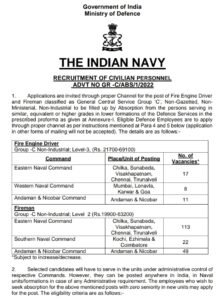 अर्ज पाठविण्याचा पत्ता- फ्लॅग ऑफिसर कमांडिंग-इन-चीफ, (SO CRC’ साठी) मुख्यालय ईस्टर्न नेव्हल कमांड, युटिलिटी कॉम्प्लेक्स (दुसरा मजला), नेव्हल बेस विशाखापट्टणम, आंध्र प्रदेश – 530014