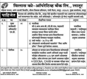 अर्ज पाठविण्याचा पत्ता- विलास को- ऑपरेटिव्ह बँक लि., लातूर, पहिला मजला, अपंग सारथी बिल्डींग, जीवन विकास प्रतिष्ठान, गांधी मैदान, लातूर – 413512