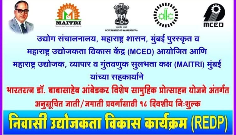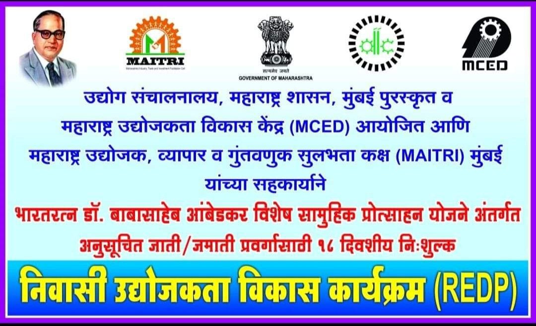 महाराष्ट्र शासन, उद्योग संचालनालय, मुंबई पुरस्कृत व महाराष्ट्र उद्योजकता विकास केंद्र (MCED) मुंबई आयोजित आणि महाराष्ट्र उद्योजक, व्यापार व गुंतवणूक सुलभता कक्ष (MAITRI) मुंबई यांच्या सहकार्याने भारतरत्न डॉ. बाबासाहेब आंबेडकर विशेष सामुहिक प्रोत्साहन योजने अंतर्गत अनुसूचित जाती (SC) आणि अनुसूचित जमाती (ST) प्रवर्गासाठी १८ दिवसीय नि:शुल्क निवासी उद्योजकता विकास कार्यक्रम आयोजन करण्यात येत आहे.