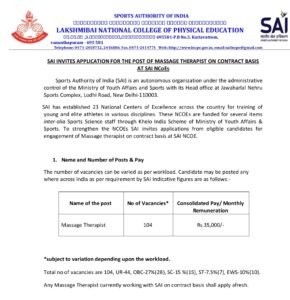 नोकरी विषयी भारतीय क्रीडा प्राधिकरण अंतर्गत भरती By Chetan Patil On Aug 2, 2022 0 Share पदाचे नाव- मसाज थेरपिस्ट पद संख्या- 104 जागा अर्ज पद्धती- ऑनलाइन अर्जाची शेवटची तारीख- 06 ऑगस्ट 2022 ईमेल पत्ता- recruitment.massagetherapist@gmail.com अधिकृत वेबसाईट- sportsauthorityofindia.nic.in 0 Share FacebookTwitterGoogle+ReddItWhatsAppPinterestEmail