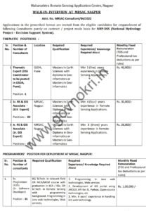 पदाचे नाव- थीमॅटिक एक्सपर्ट, कनिष्ठ आरएस आणि जीआयएस असोसिएट, सीनियर आरएस आणि जीआयएस असोसिएट, कनिष्ठ आरएस आणि जीआयएस सहाय्यक, ऑफिस असिस्टंट. सीनियर प्रोग्रामर, ज्युनियर प्रोग्रामर.