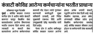 गेल्या दोन ते अडीच वर्षांपासून कोविड काळात राज्यात आरोग्य क्षेत्रात अनेक जणांनी कंत्राटी पद्धतीने आरोग्य सेवा दिली आहे. यात वैद्यकीय सहायक, आशा वर्कर, अंगणवाडी सेविका तसेच इतर वैद्यकीय कर्मचाऱ्यांचा समावेश आहे. कोविड काळात जीवावर उदार होऊन या कर्मचाऱ्यांनी सेवा बजावली आहे.