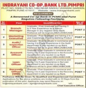 इंद्रायणी कॉ-ऑप बँकेत भरती