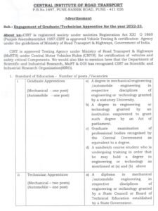 अर्ज पाठविण्याचा पत्ता– हेड-एएसडी, सेंट्रल इन्स्टिट्यूट ऑफ रोड ट्रान्सपोर्ट, पी.बी. नंबर 1897, पुणे-नाशिक रोड, भोसरी, पुणे – 411026