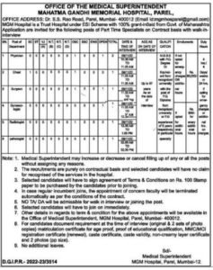मुलाखतीचा पत्ता- वैद्यकीय अधीक्षक कार्यालय, एमजीएम रुग्णालय, परळ, मुंबई– 400012