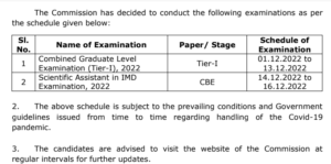 कर्मचारी निवड आयोगाने (SSC) डिसेंबर 2022 मध्ये या भरती परीक्षेच्या टियर 1 चा पहिला टप्पा आयोजित करण्याची घोषणा केली आहे. आयोगाने आज 31 ऑक्टोबर 2022 रोजी जारी केलेल्या सूचनेनुसार, CGL टियर 1 परीक्षा 2022 ही 1 डिसेंबरपासून घेतली जाईल आणि ती 13 डिसेंबर 2022 पर्यंत सुरू राहील. अशा परिस्थितीत, जेव्हा परीक्षा सुरू होण्यास एक महिन्याचा कालावधी शिल्लक असतो, तेव्हा उमेदवार एसएससी सीजीएल टियर 1 सीबीईच्या अपडेटसाठी वेळोवेळी अधिकृत वेबसाइट ssc.nic.in ला भेट देत राहावं.